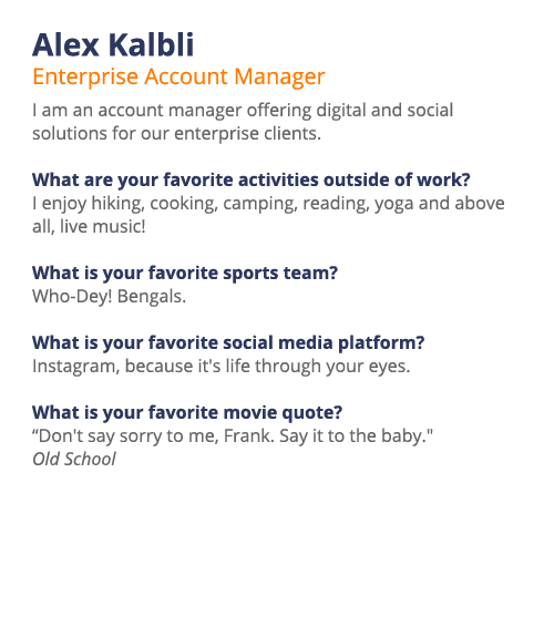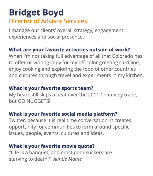 We are from all walks of life, bringing with us unique skills and interests. As entrepreneurs, artists, runners, writers, soccer players, designers, yogis and skiers, we are each united by our commitment to creativity, excellence, strategic thinking, engagement, friendship and spontaneity.