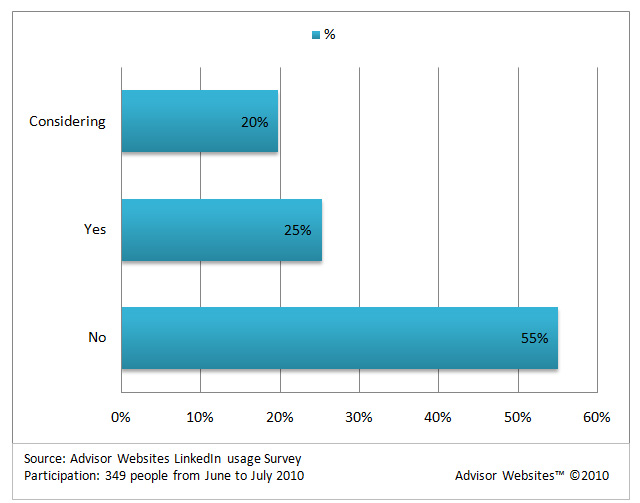 A recent LinkedIn survey by Advisor Websites found that less than 25% of advisors polled used LinkedIn DirectAds (Pay by clicks or impression solution from LinkedIn), and 20% were considering using it. (see chart below)
