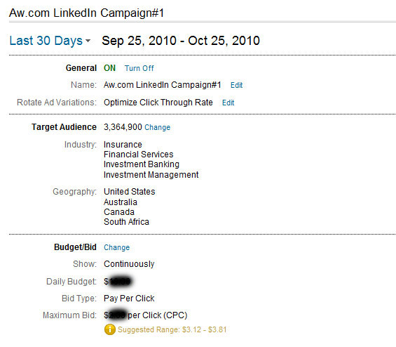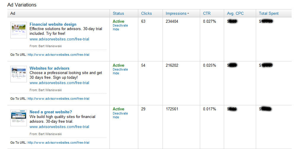 I have spoken to hundreds of financial advisors across the country and the few that were using LinkedIn DirectAds were extremely satisfied with how it was performing for them. Most found it more effective than Google Adwords (Google’s pay per click program) and had reduced their monthly Google budget in favor of LinkedIn.