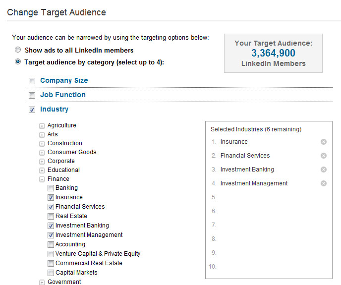 The power of LinkedIn DirectAds lies in the way it allows you to drill down the 32 million U.S. based LinkedIn members and let you decide who you want to target. Let’s say your target audience is Lawyers, then you narrow your audience to this specific category (670,000 as of August 9 2010).