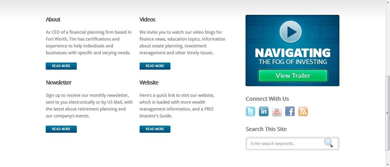 - Lead Capture: Entice your readers to enter their email and phone number in order download your Investor Awareness Guide or Top 10 Tips for Retirement planning. This not only educates your prospect and positions you as the expert, but it will also give you a lead to follow up with!