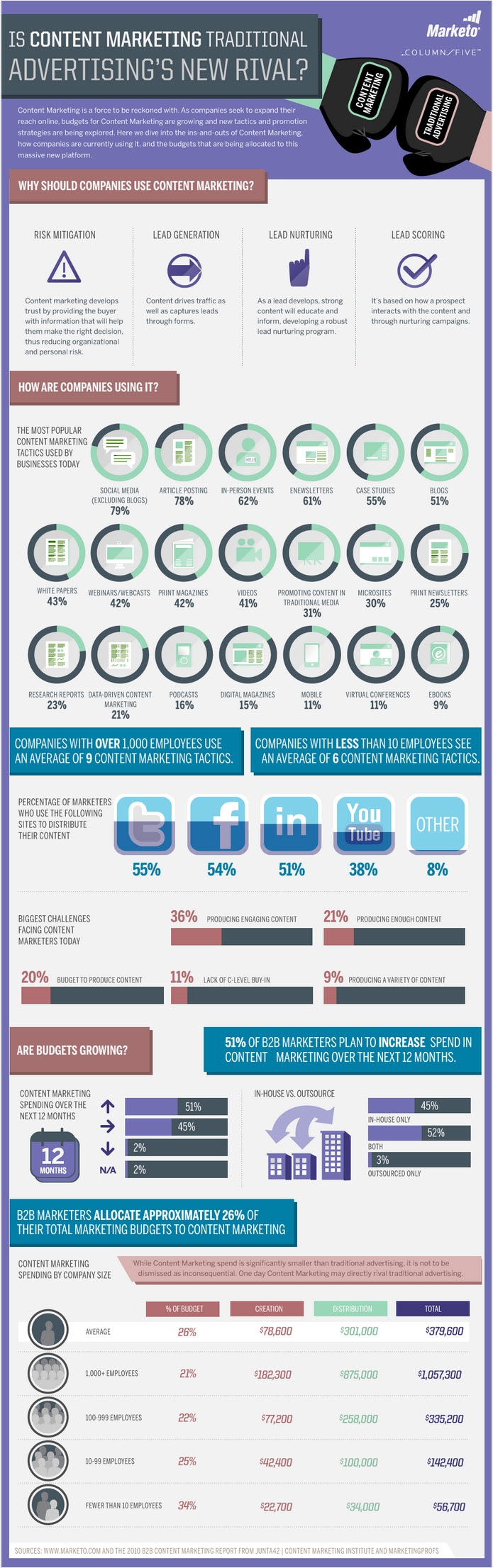 Aaah, finally, the bread and butter of a social media strategy: content. Check out the percentage that social media has in relation to the most popular content marketing tactics used by businesses today: 79%. And that excludes blogs! This infographic is quite possibly my favorite when it comes to showcasing how important content marketing is within each social media strategy. It lists the reasons why: risk mitigation, lead generation, lead nurturing and lead scoring (notice that hot word: LEADS). It also lists the percentage of marketers using Facebook, LinkedIn, Twitter and YouTube to distribute their content.