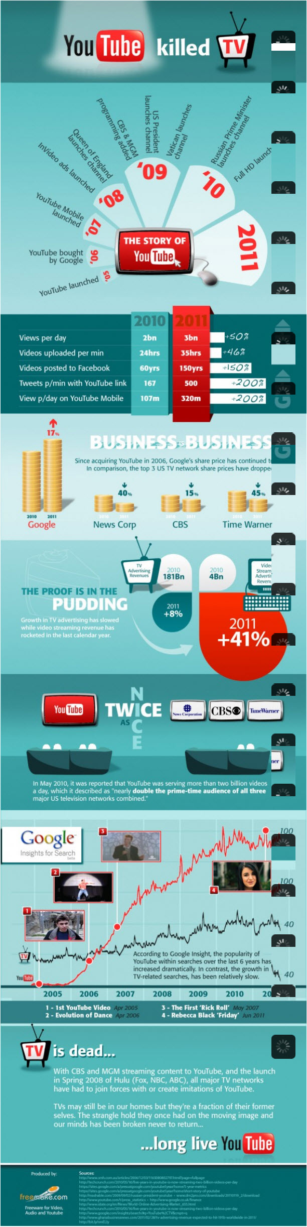 This infographic, “YouTube Killed TV” paints an amazing picture of how far video has come in an online setting. More and more organizations are utilizing video in their marketing strategy, and this infographic explains why. With a 50% increase in views per day from 2010 to 2011, growth in TV advertising has subsided dramatically. And with YouTube holding its place as the 2nd ranked search engine online (behind Google), financial professionals can easily increase their SEO rank simply by creating, uploading and posting their videos on their social networks.