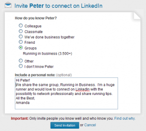 Personal messages don’t take a lot of time to create, but the return you’ll find you receive from them is huge in comparison. A huge time saver is compiling a bank of personalized scripted messages that can be used for different scenarios, that way you can use a specific message for someone each and every time you want to connect. Create, build and manage your social network connections in the same fashion you do your offline connections. Take advantage of the example below, and if you have any questions please let us know.